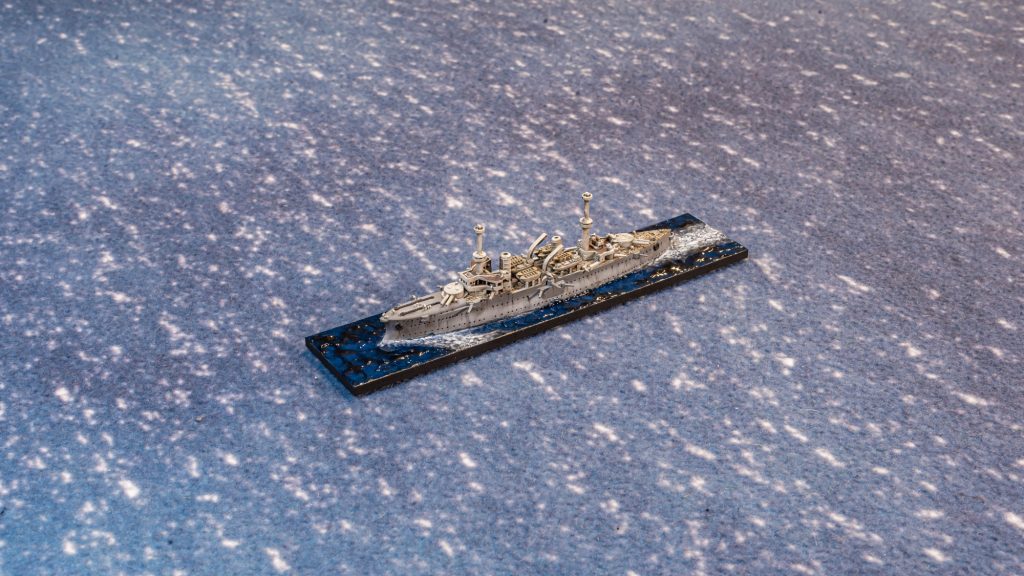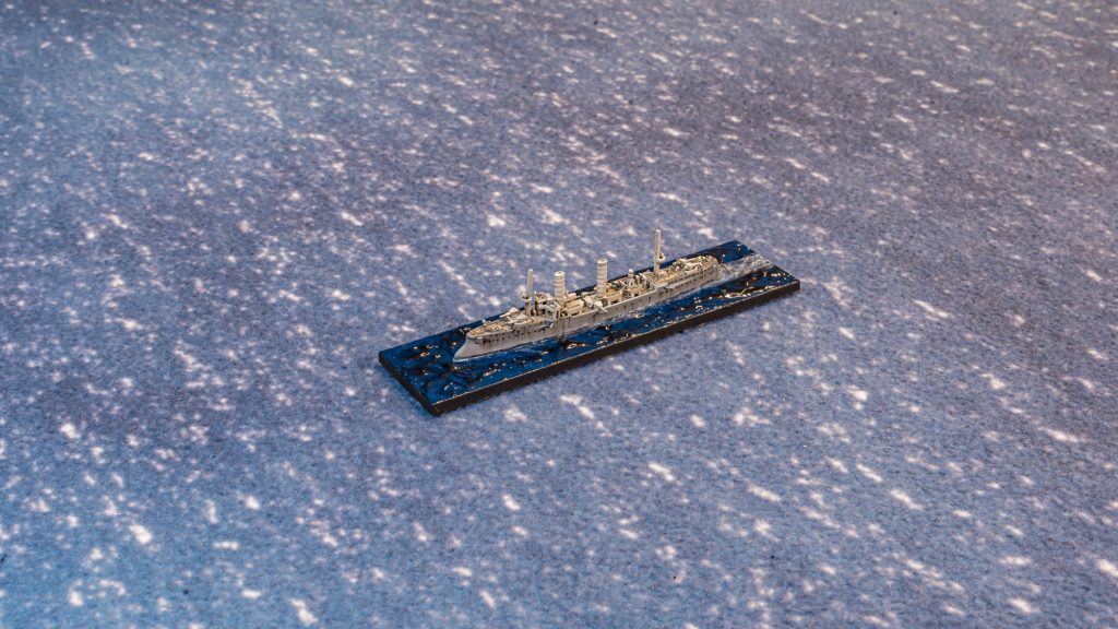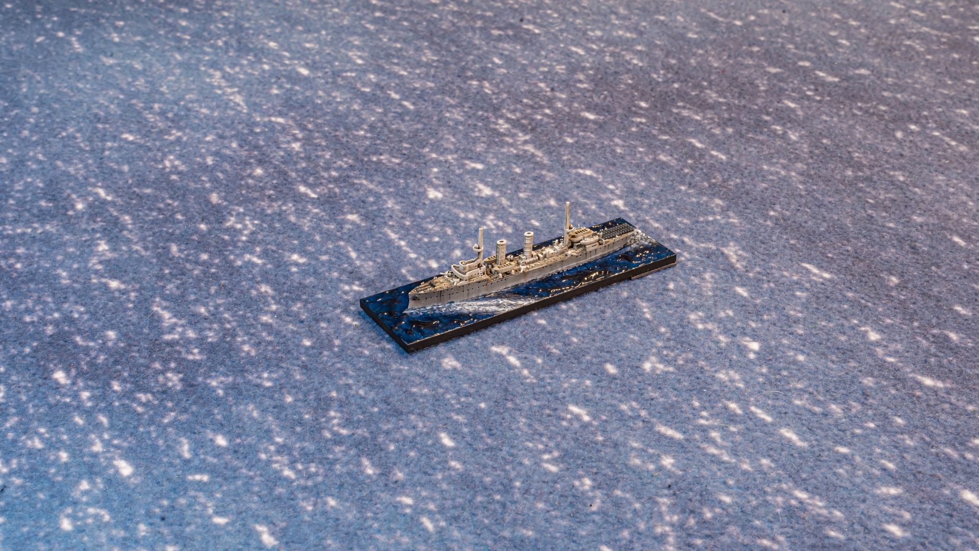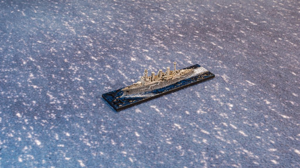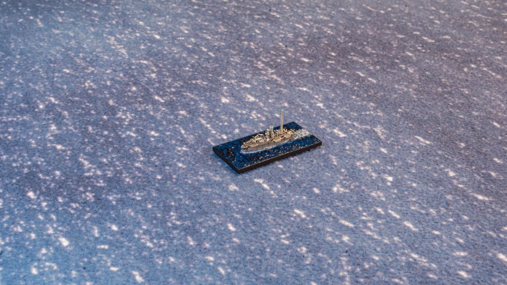 Nasze, firmowe podstawki z HDFu należy najpierw pomalować 899 Dark Prussian Blue lub analogicznym, ciemnoniebieskim kolorem (np. Kantor Blue od GW). Kolor podstawki wpłynie na kolor wody. Po przyklejeniu modelu okrętu nakładamy preparat Mig Acrylic Water Deep Oceans A.MIG-2200 lub analogiczny, np. z Vallejo.
