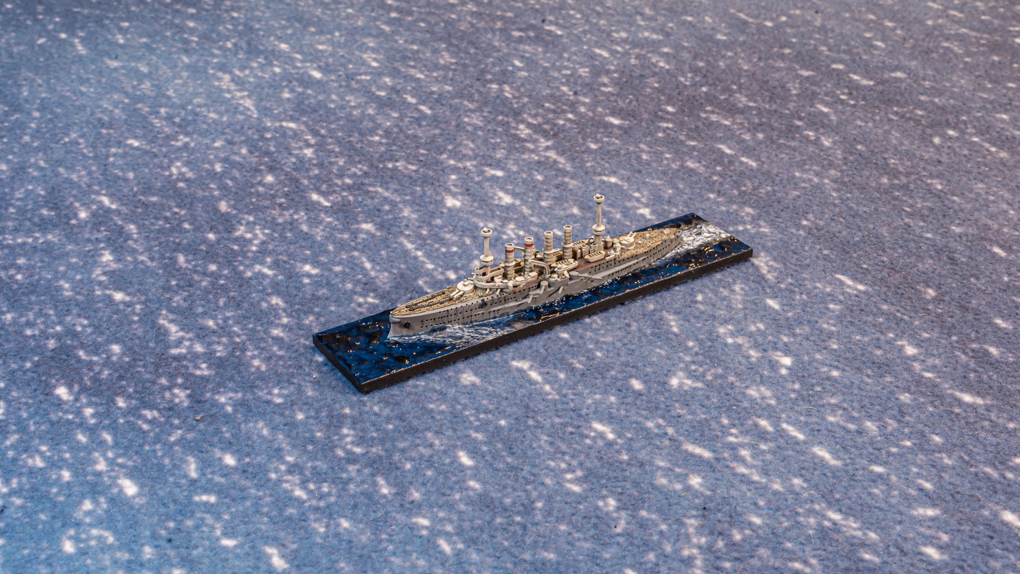 Rosyjska flota bałtycka miała zupełnie inne barwy wojenne – czarne kadłuby i wszystkie pozostałe elementy, z wyjątkiem kominów, które pomalowano na kolor żółtej ochry (górne 20% na czarny). Zatem tutaj najlepiej użyć kontrastu Black Templar z GW, lub Vallejo 862 Black Grey (i potem nieco jaśniejszy suchy pędzel).