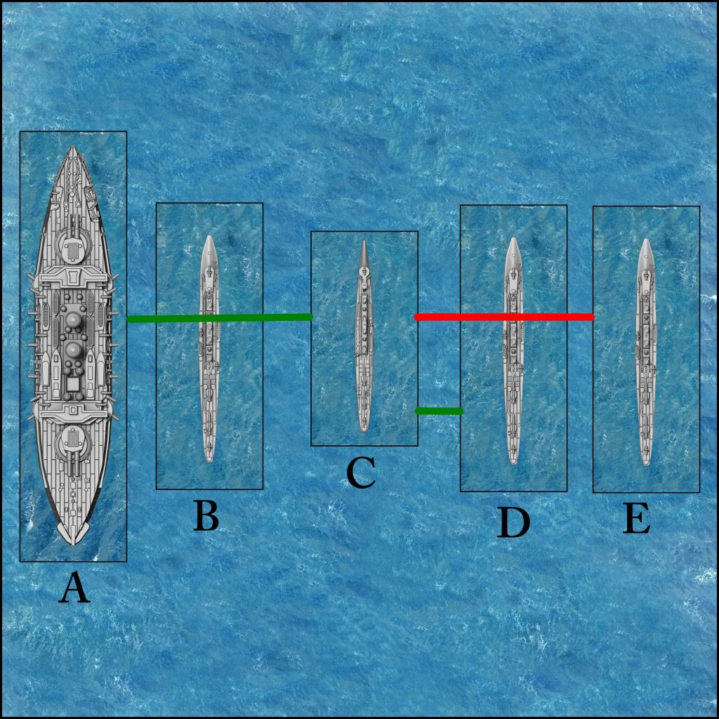 Ship C has line of sight to ship A, since a ship with the “small target” trait does not block visibility to a ship that does not have this trait (in this case “A”). Conversely, a ship without this trait (let us call her “large” for simplicity) has line of sight to a ship with the “small target” trait (let us call her “small”), even if another ship with this trait is positioned between them (case of A, B, and C).