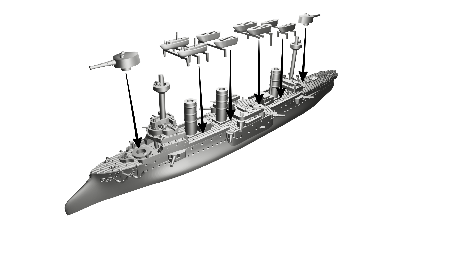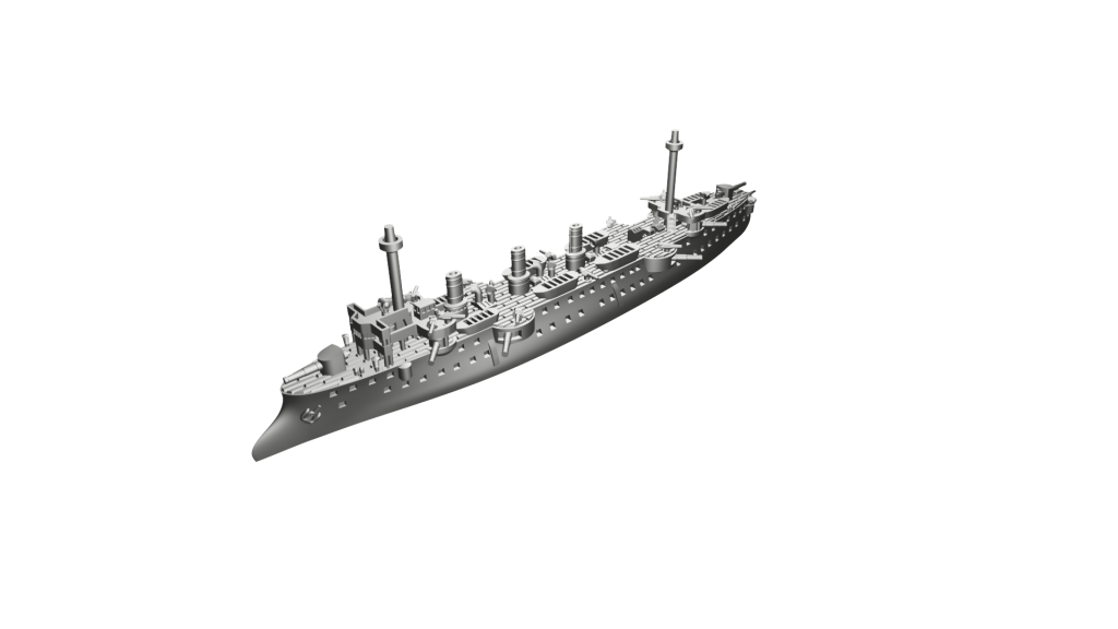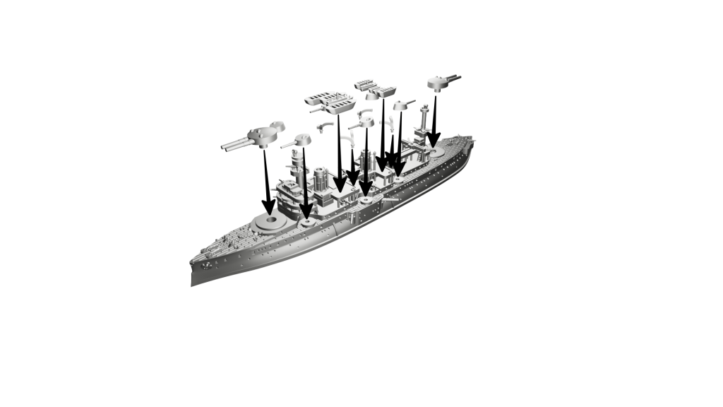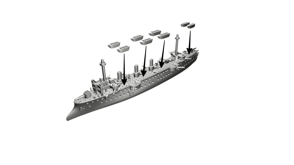 Schemat kolorów: Francuski (kadłub czarny, nadbudówki, kominy i maszty “Toile Mouillée”, co odpowiada Vallejo 72.098 Elfic Flesh, lub Vallejo 70.819 Iraqi Sand. Pokłady Vallejo 72.032 Bone White lub jaśniejszy, np. AK 11114 Deck Tan). Łodzie białe (burty), góra łodzi w kolorze drewna LUB cały szary (Vallejo dark sea grey 70.991).