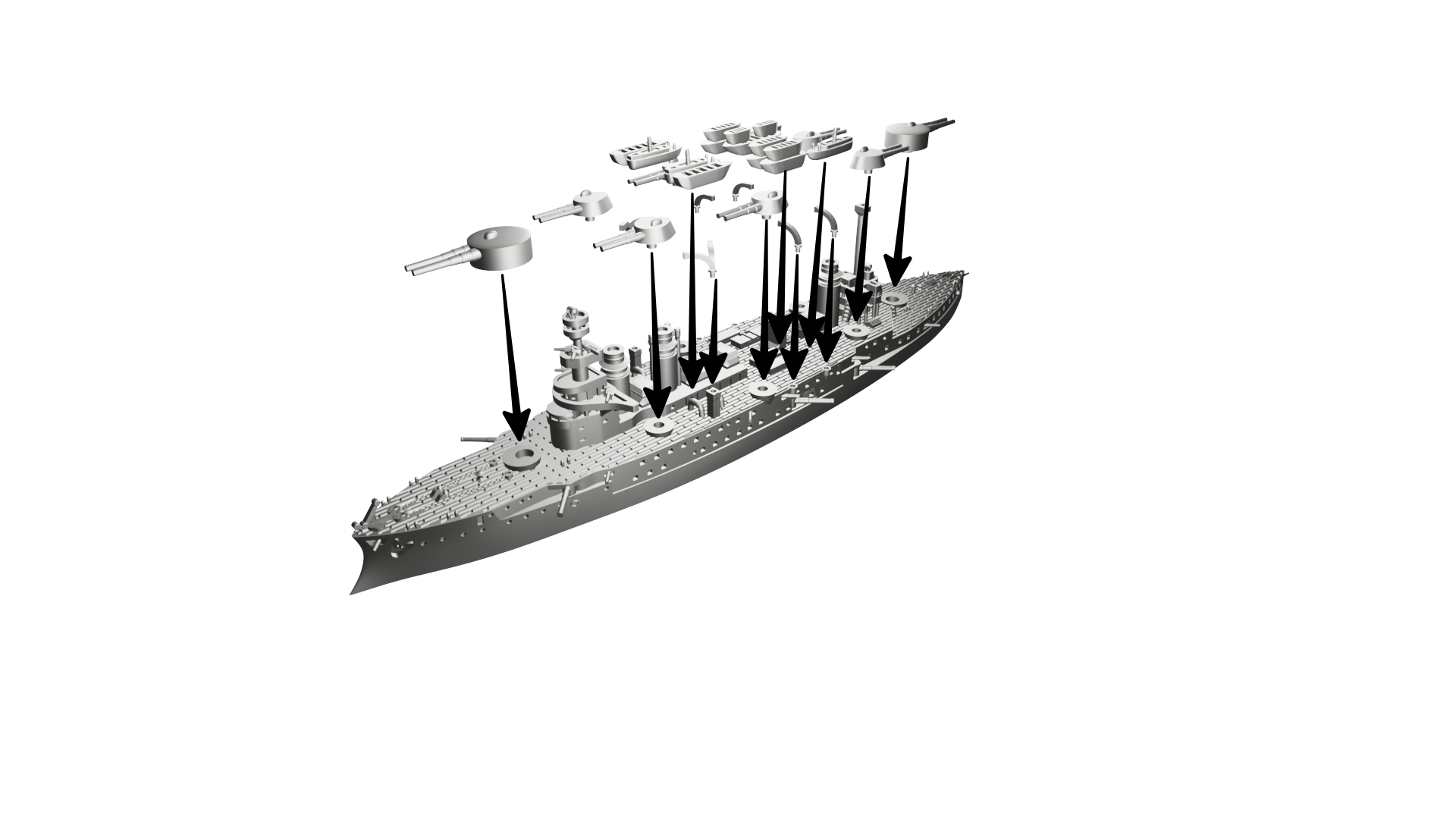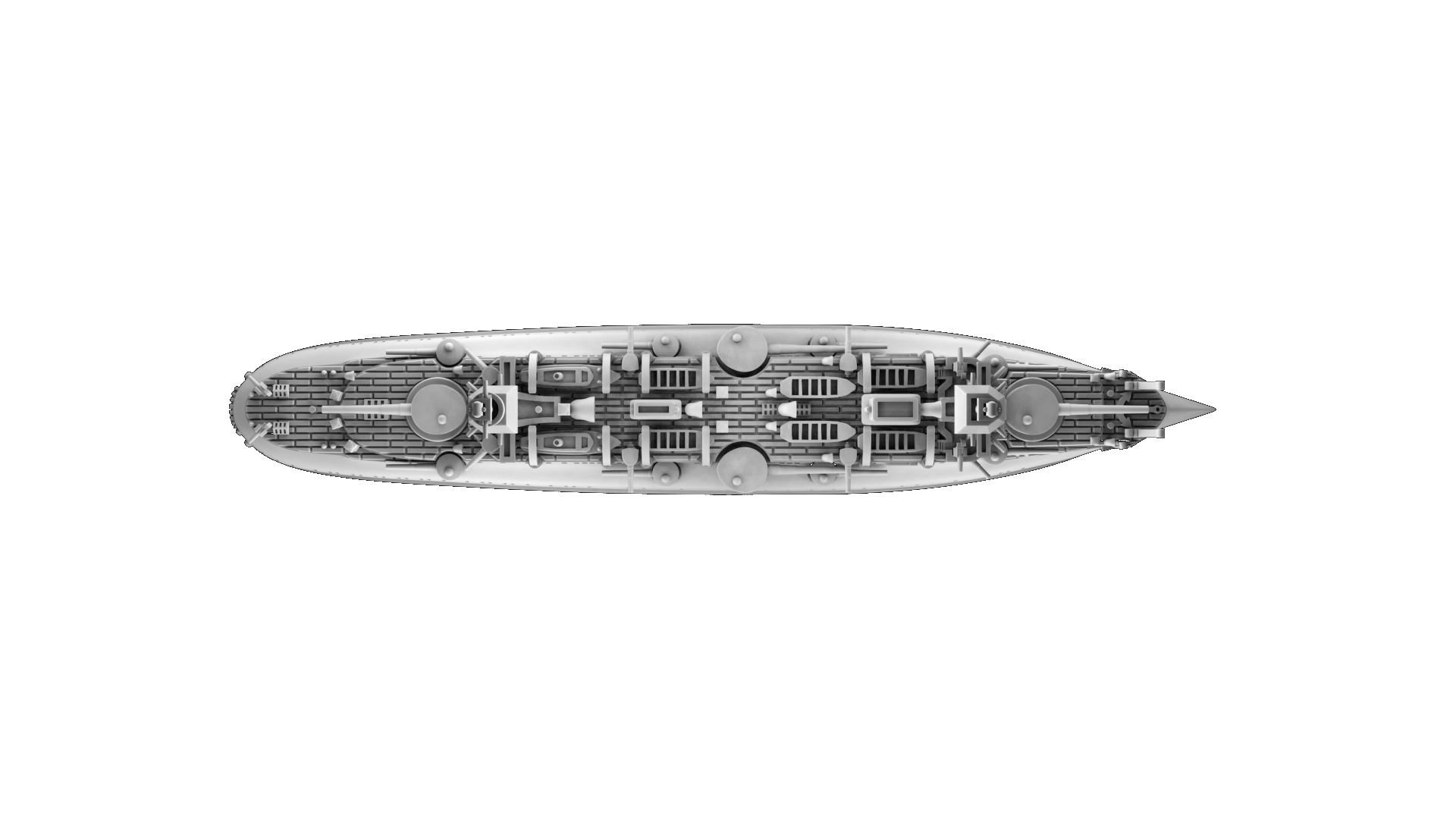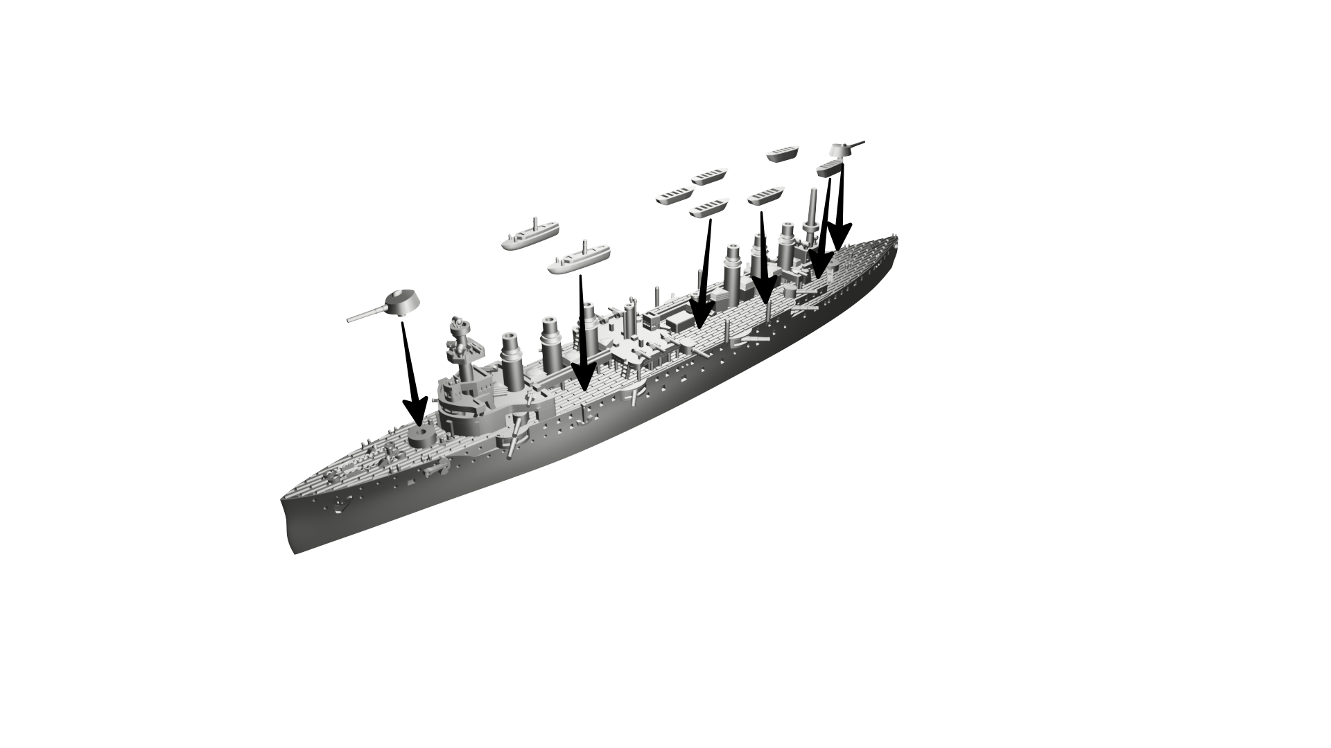 Schemat kolorów: Francuski (kadłub czarny, nadbudówki, kominy i maszty “Toile Mouillée”, co odpowiada Vallejo 72.098 Elfic Flesh, lub Vallejo 70.819 Iraqi Sand. Pokłady Vallejo 72.032 Bone White lub jaśniejszy, np. AK 11114 Deck Tan). Łodzie białe (burty), góra łodzi w kolorze drewna LUB cały szary (Vallejo dark sea grey 70.991).